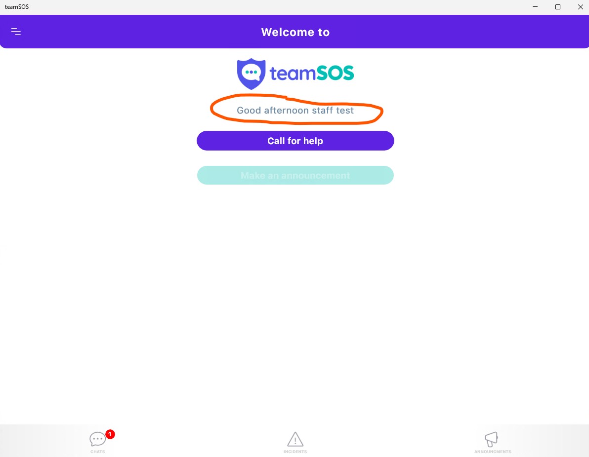 Then on the last screen whichj is the main teamSOS app it should show your name shown (circled in orange in this case) as per the image below:
