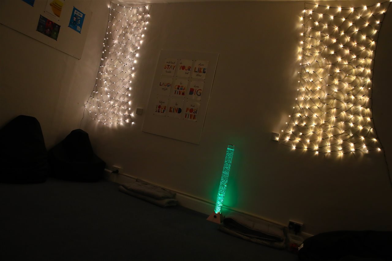 There are smaller quieter spaces in the Hub for pupils to use to take some time if they need space to relax and have headspace. The sensory room has relaxing lights, bubble lamps, beanbags and weighted blankets so offering a quiet, calming space. There is a bright airy chillout room to work, read a book, play a game, carry out activities to support mindfulness or just have some time out before going back into school.