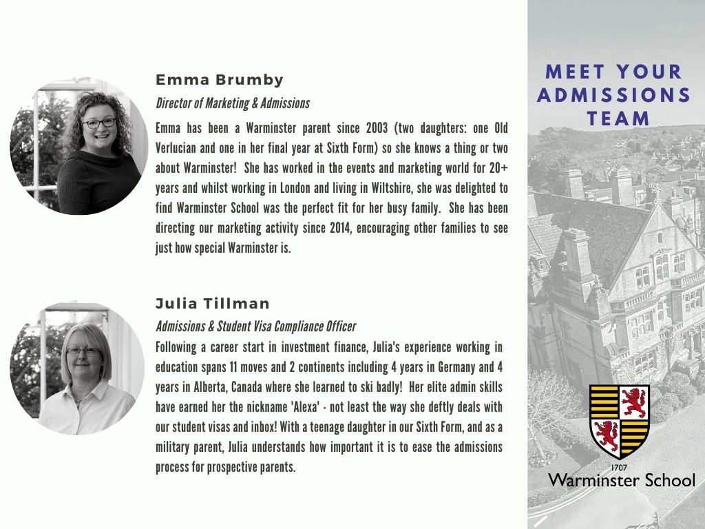 Questions? Please contact our friendly Admissions Team, they would be delighted to hear from you! Please email and they will get in touch! admissions@warminsterschool.org.uk