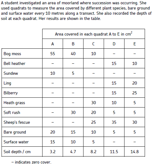 Use the data from the table to plot a scatter graph of soil depth against area covered by bare ground, soft rush and bog moss. What conclusions does your graph suggest?